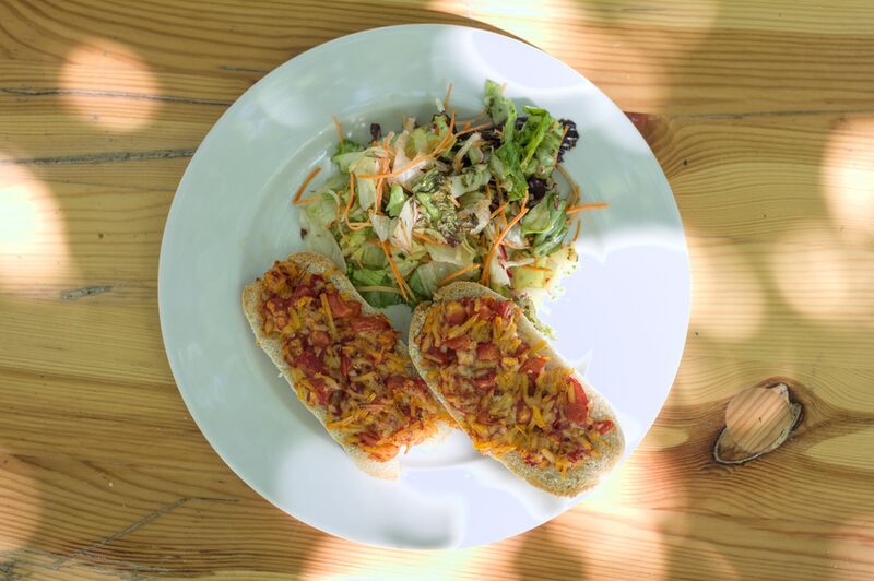 Vegane Aufbackbaguetts mit Tomaten-Käse Belag und Beilagensalat