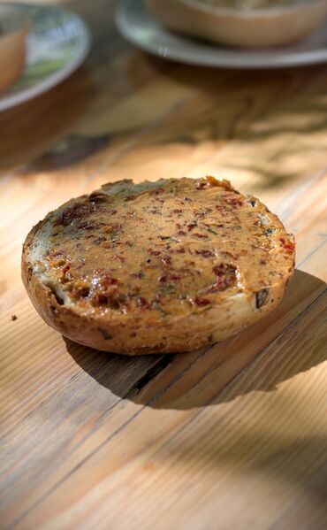 Brötchenhälfte bestrichen mit einer veganen Tomatenbutter